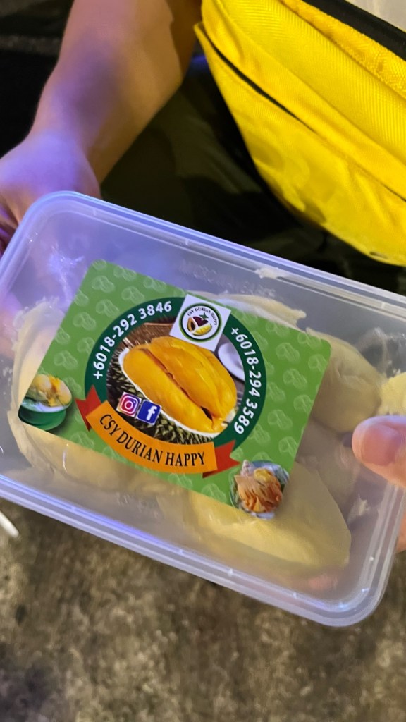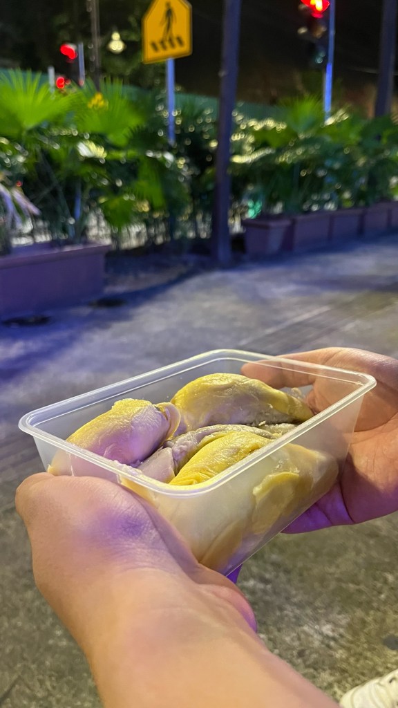 Story Time: It was 11pm on our last night in KL, and we still havent’ had the chance to eat durian. We decided to YOLO and GrabFood one packet of durian. The delivery charge was not too bad, and it was a funny sight to see the Grab rider taking out one small plastic bag from the big delivery bag at 12am.