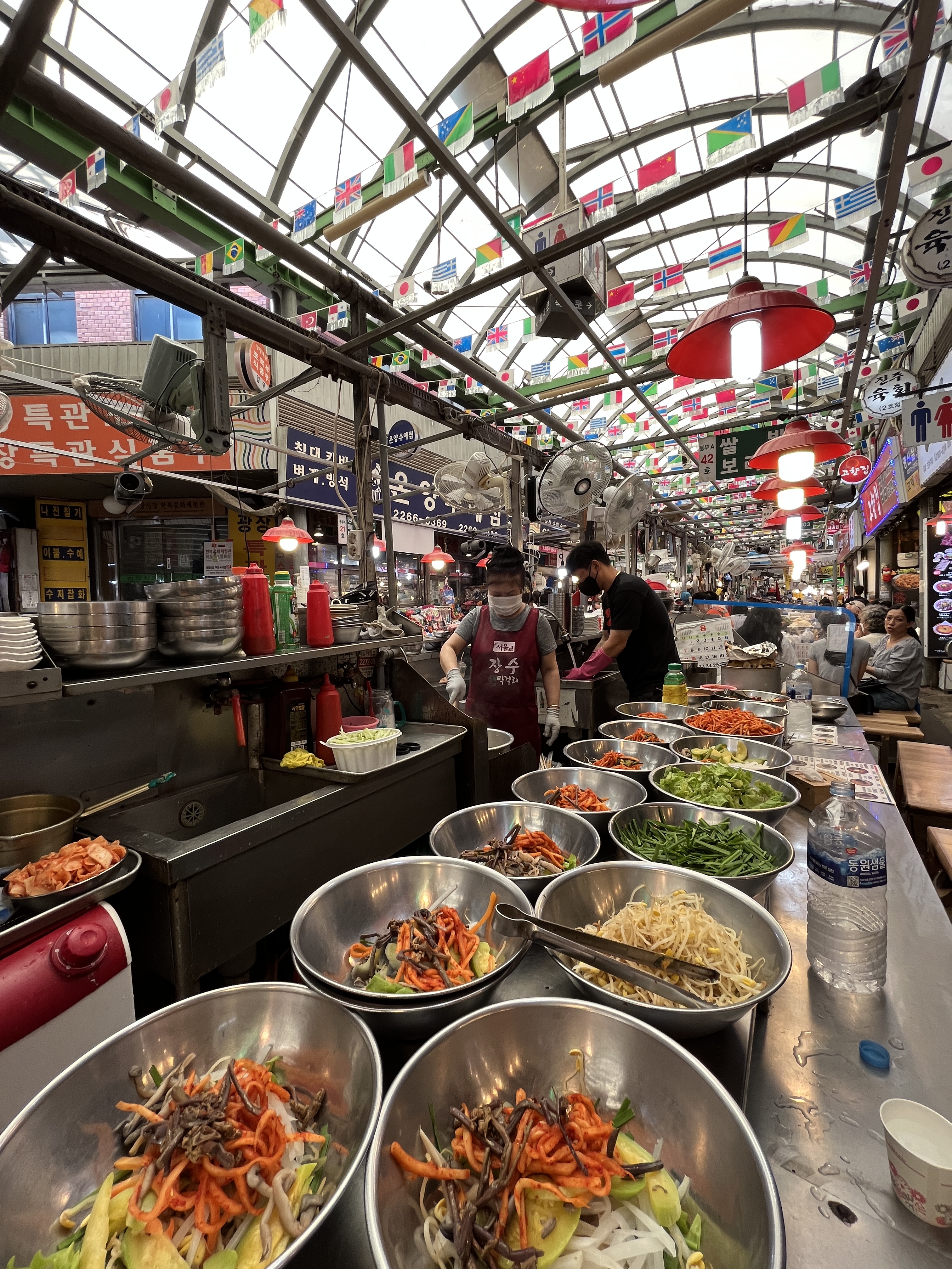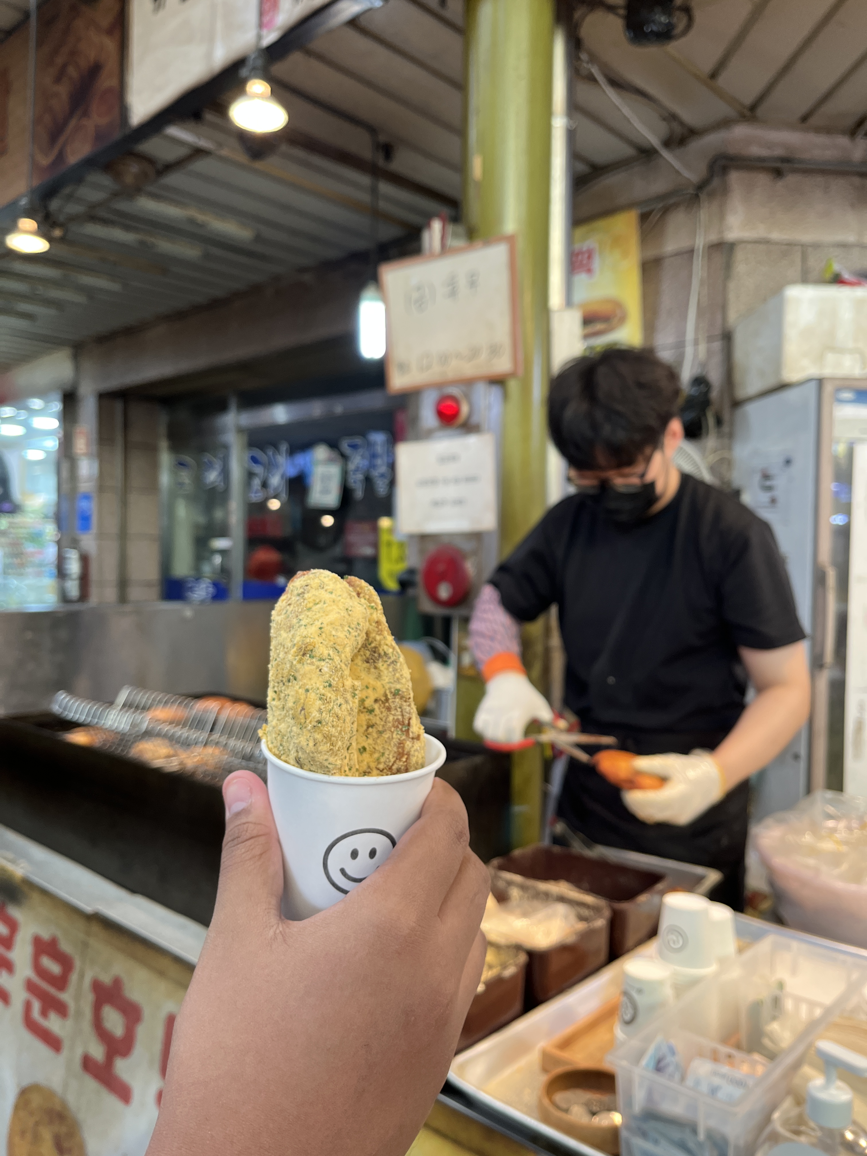 Food options are plenty at any traditional Korean market. Typically, best to avoid the shops that sells sundae (the sausage looking item, which is essentially pork). There was one shop that was crowded because it was featured on a Netflix show.