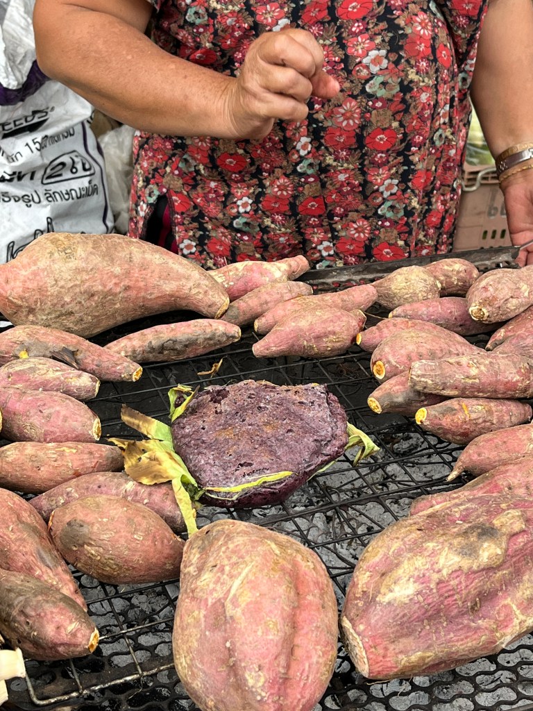 We tried this grilled taro sticky rice wrapped in banana leaves. We were unfamiliar with it, so she animatedly demonstrated how she made it and how to eat it. We tried it on the spot!