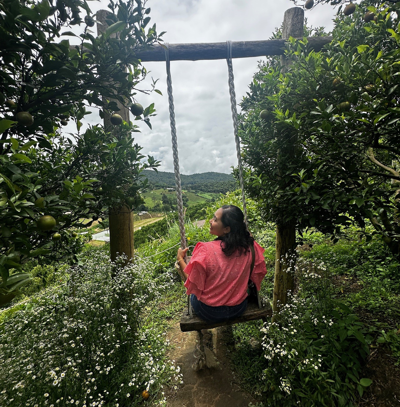 Once you enter the orchard, spot the cute little cottage cafe that sold freshly squeezed orange juice and orange-infused drinks. Seats are provided nearby – a makeshift veranda with cute vintage props. There were also other unique seating areas scattered all around the orchard.