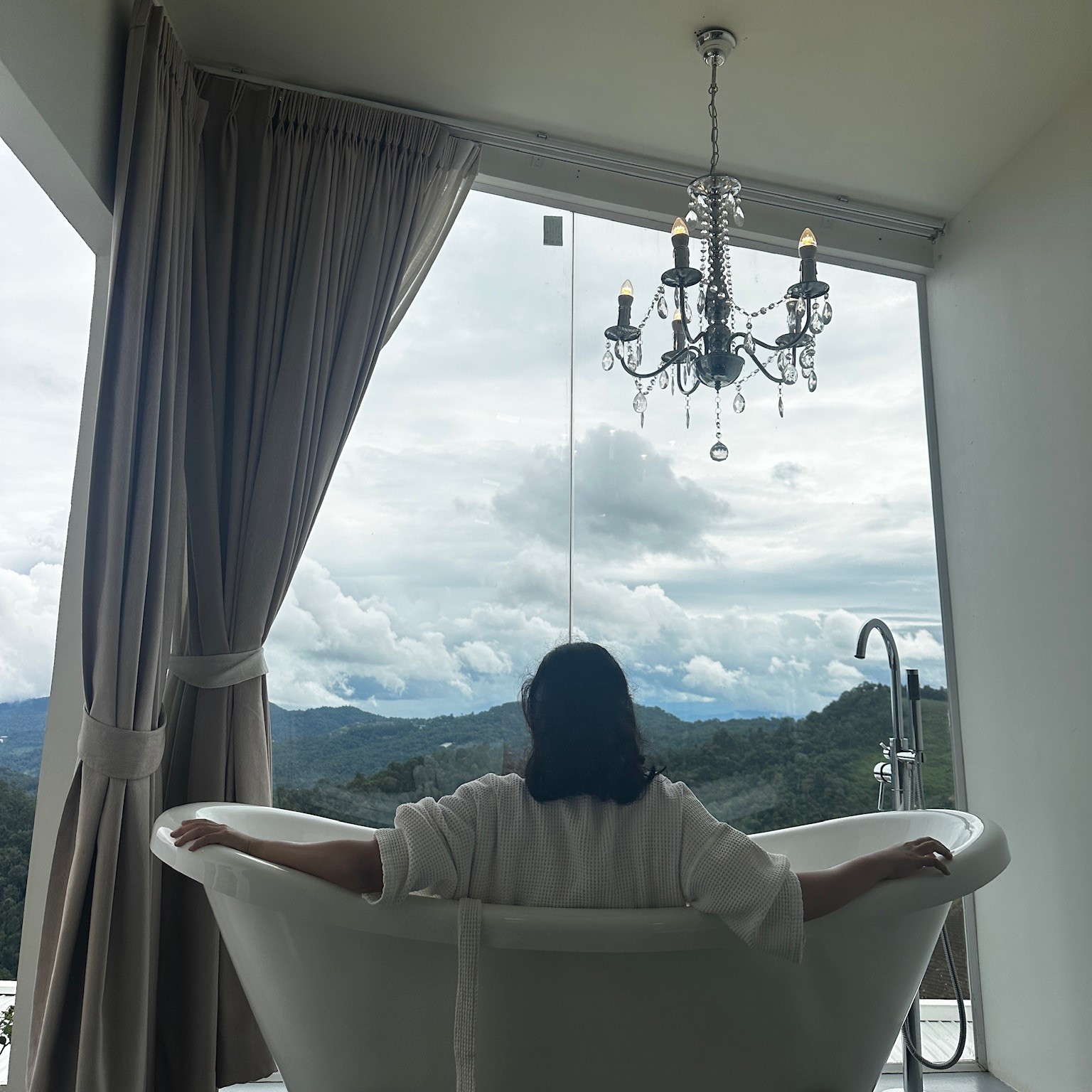 If you want to stare into nature all day, this is perfect. You have a full view of the mountains from the bed, the balcony, and the bathroom. They placed the bathtub right in front of the glass wall and adorned it with a chandelier above. The high ceilings and glass windows also made the modest room look spacious.