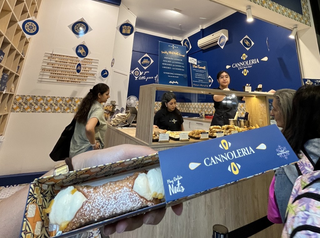 I was intrigued by this shop’s uniquely shaped dessert and discovered it was a cannoli – a thin, crunchy pastry filled with flavored ricotta and dusted with powdered sugar. We tried the lemon filling, which was pretty good, though it was a bit tricky to eat gracefully.